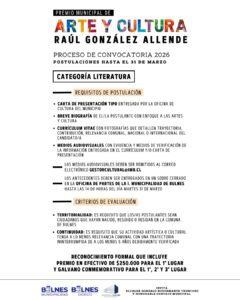 Quien obtenga el primer lugar recibirá un reconocimiento público, un galardón y un premio en dinero de $250.000. Además, se entregarán galardones para el segundo y tercer lugar. Plazo de postulación: Tienes hasta el 31 de marzo de 2026 a las 14:00 horas para entregar tus antecedentes en la Oficina de Partes del municipio. ¿Quieres postular o proponer a un talento de nuestra comuna? Revisa todos los requisitos, documentación requerida y criterios del jurado en el siguiente documento. Descarga las bases oficiales aquí y sé parte de nuestra historia cultural: >DESCARGA BASES AQUÍ<