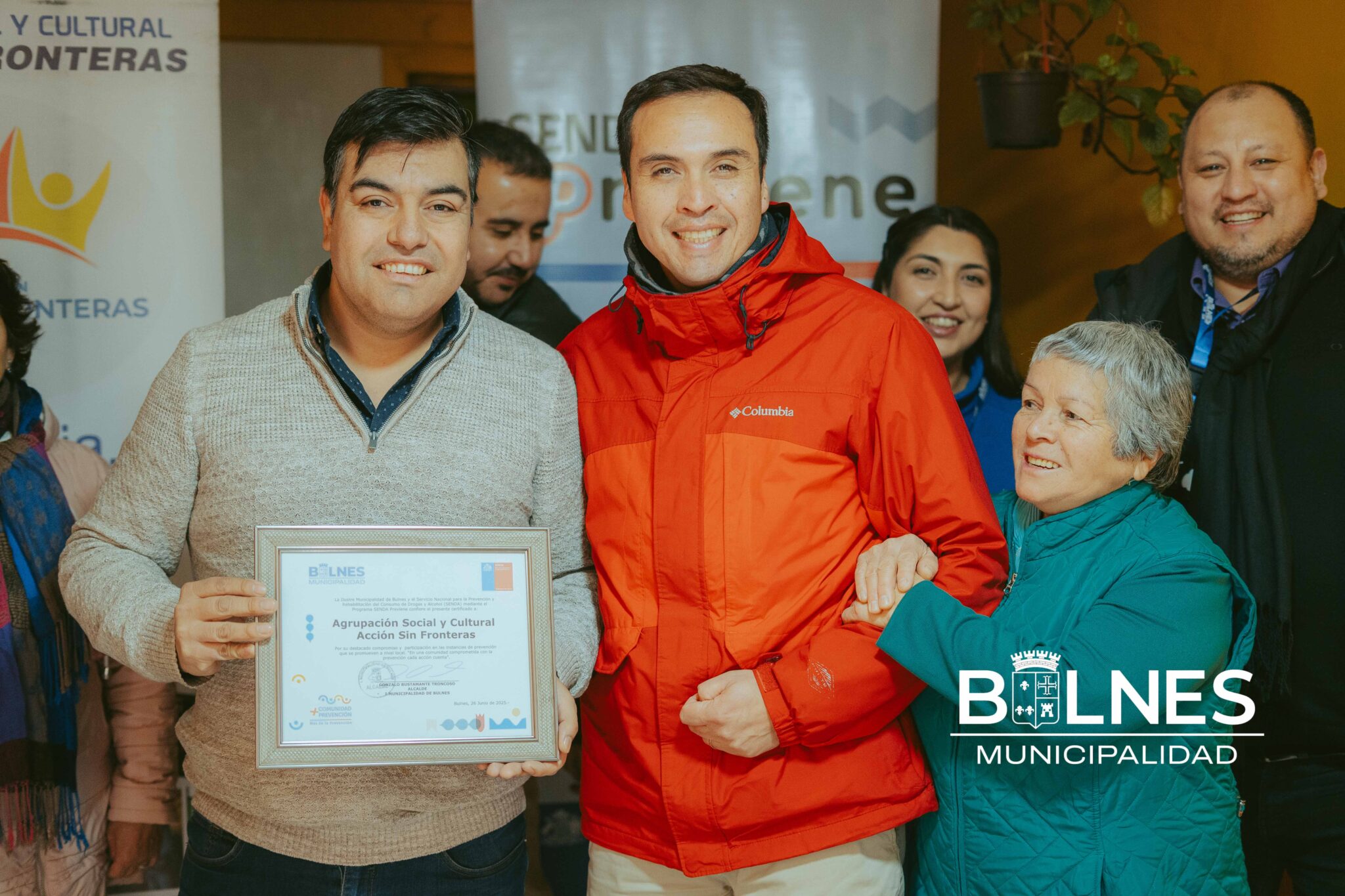 En una emotiva instancia, el alcalde Gonzalo Bustamante, junto al equipo de SENDA Bulnes, entregó un reconocimiento a la agrupación Acción Sin Fronteras, destacando su valioso compromiso con la prevención del consumo de drogas y alcohol en nuestra comuna.