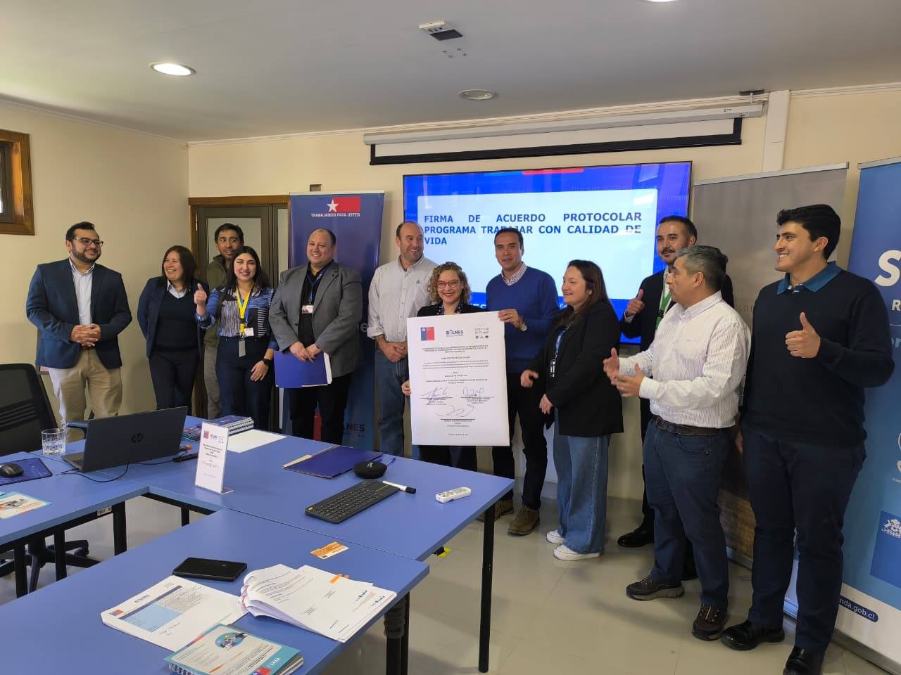Bulnes, viernes 24 de abril de 2026.- Con la firma de un acuerdo protocolar de colaboración entre Senda Ñuble, la empresa local Comercial de Campo y el Municipio de Bulnes, se selló el vamos para ejecutar el programa “Trabajar con Calidad de Vida”, que apunta a prevenir el consumo de alcohol y drogas en espacios laborales.