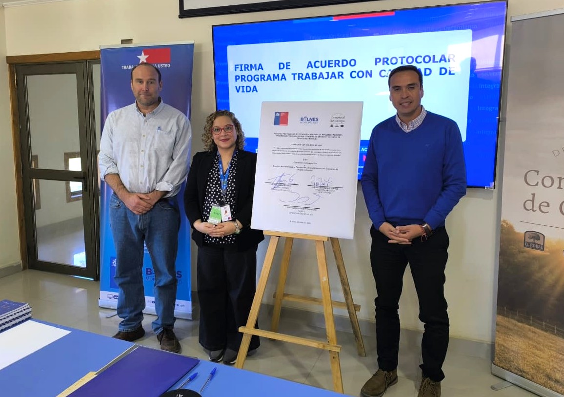 Estamparon su firma el gerente general de la compañía, Tomás Larraín; la directora regional de Senda, Luisa Contreras y el alcalde de Bulnes, Gonzalo Bustamante, quienes hicieron hincapié en la importancia de alejar el consumo de este tipo de sustancias en espacios laborales.